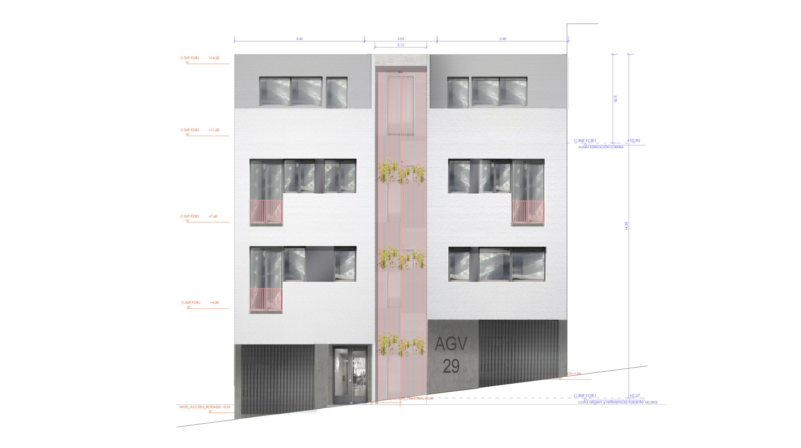 La imagen del edificio se ha diseñado de forma que las fachadas se ven ordenadas por los espacios de accesos y soportal en planta baja, núcleo con celosía de escalera, y las terrazas de los áticos, que generan espacios de sombra alternados con la sobriedad del paño liso de fachada.