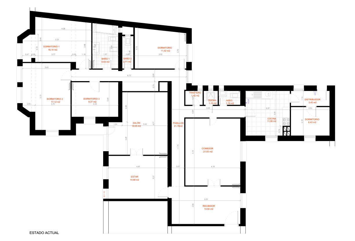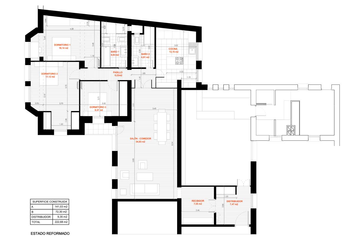 De esta nueva distribución resulta una «unidad de uso» de 141 m2 con tres dormitorios [DRC11 I A], y otra de 72 m2 concebida como apartamento de un único dormitorio y cocina integrada en el salón [DRC11 I B].