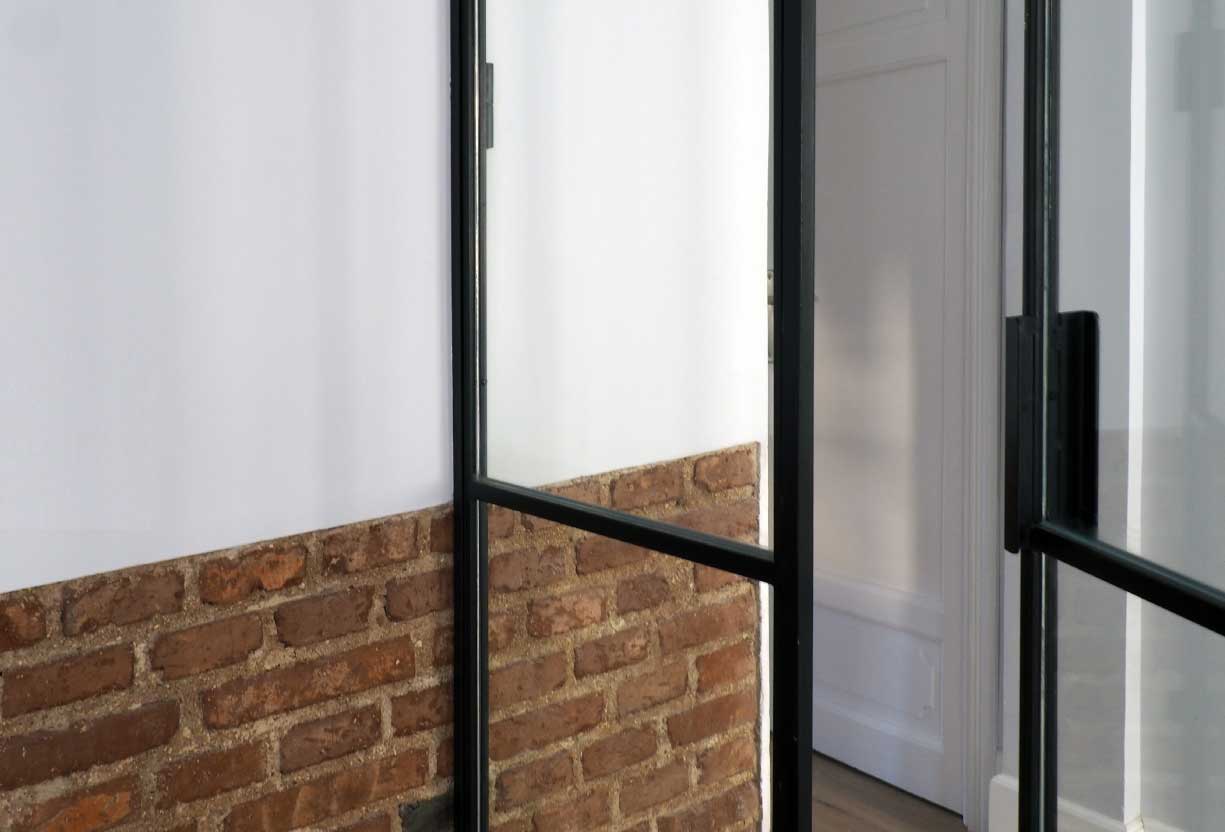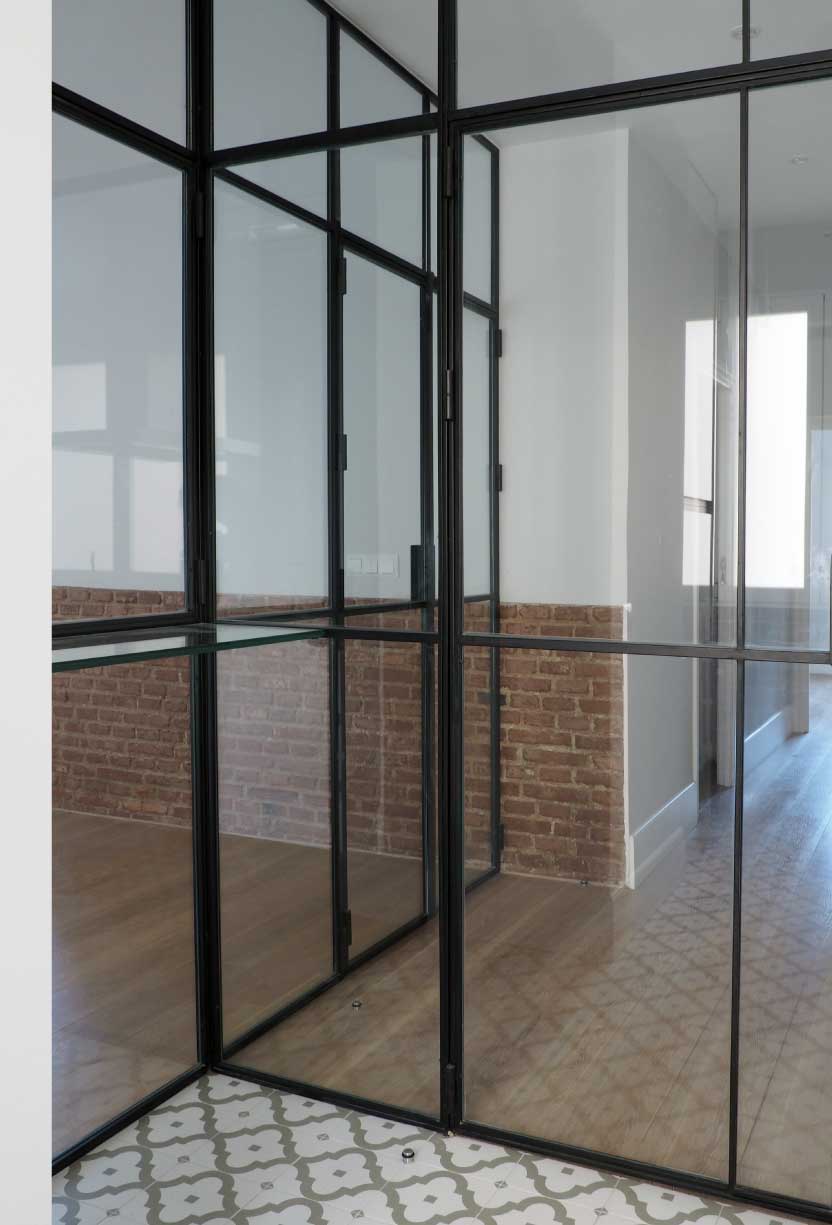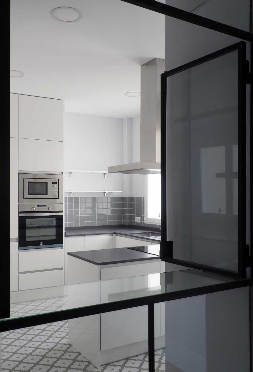 Como elemento principal, la mampara de cerrajería y vidrio diseñada en T para el salón y cocina, que conecta estos espacios entre ellos y con el resto de la vivienda, prolongando sus límites y aportando gran luminosidad al espacio de circulación.