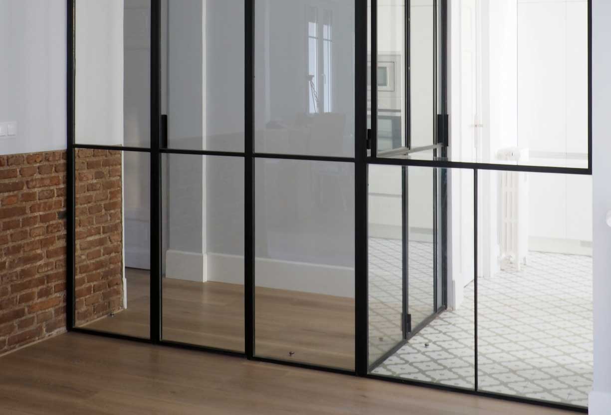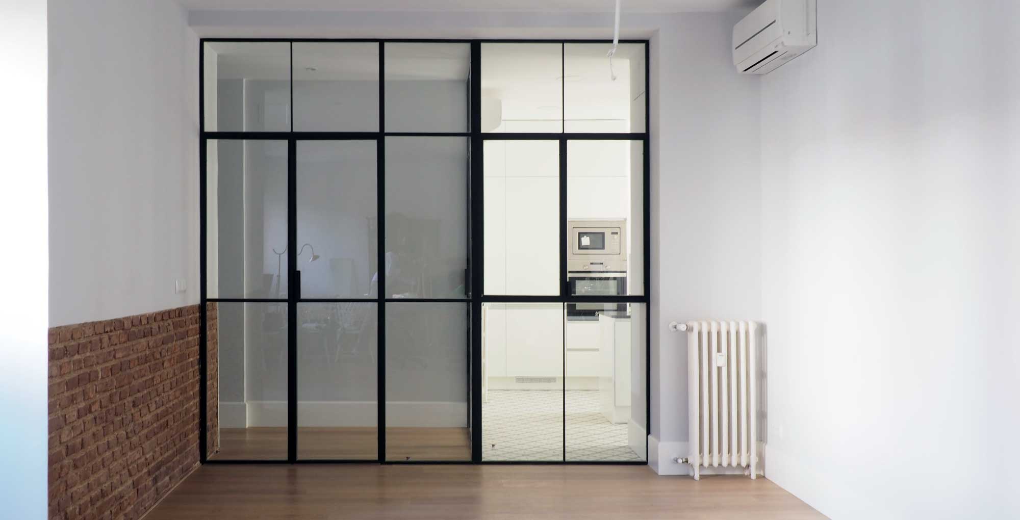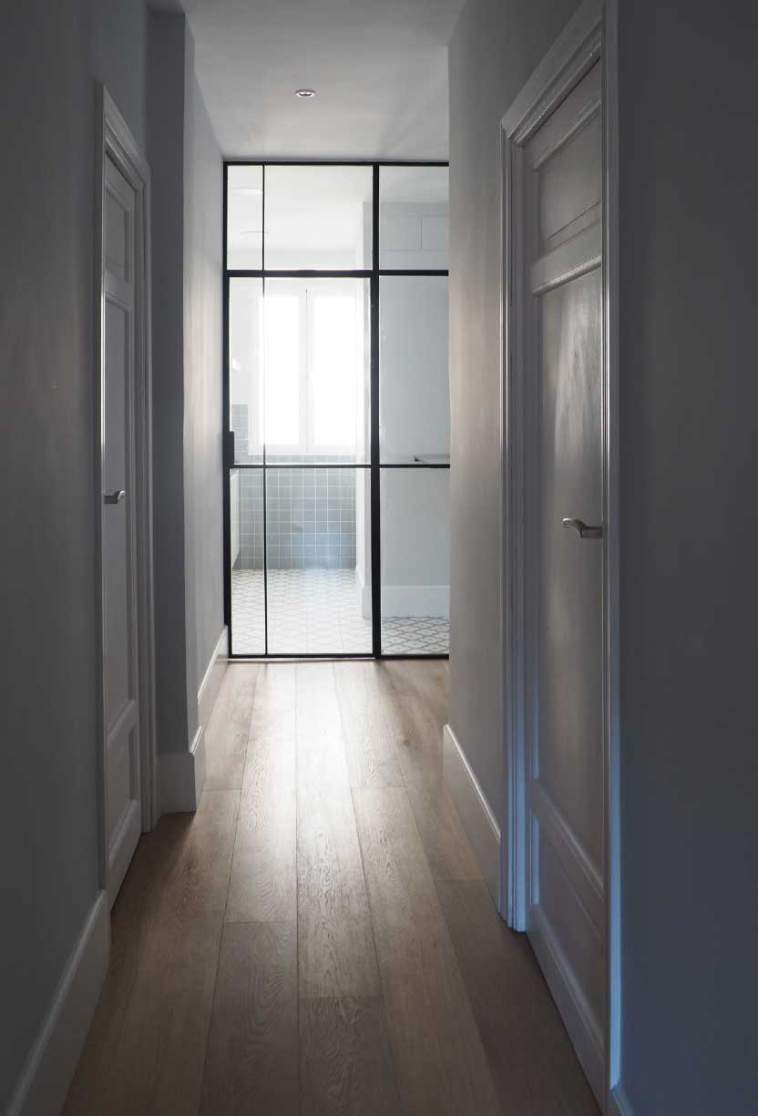 Como elemento principal, la mampara de cerrajería y vidrio diseñada en T para el salón y cocina, que conecta estos espacios entre ellos y con el resto de la vivienda, prolongando sus límites y aportando gran luminosidad al espacio de circulación.